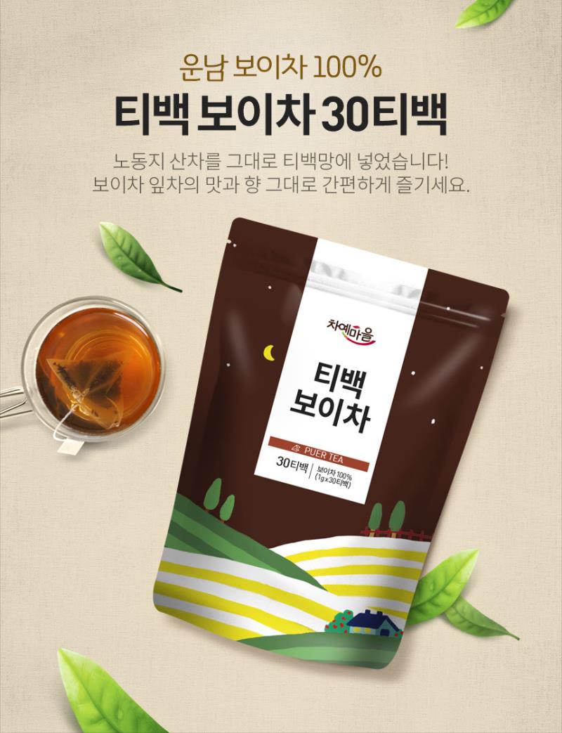 차예마을의 보이차 티백은 중국 해만차창의 노동지를 세절하여 그대로 티백망에 넣은 제품입니다. 중국 운남성에서 자라는 대엽종 차나무 찻잎을 살청한 후 햇볕에 말려 만들어진 후발효차입니다. 우려짐이 빠르며 탕색이 갈홍빛으로 맑습니다. 맛은 잡내없이 깨끗하고 담백하며 부드럽고 목넘김이 좋습니다. 가성비가 좋은 보이숙차로 편하게 늘 드시기에 좋은 차입니다. 해만차창은 중국 운남성의 뛰어난 대엽종 차나무 차엽을 원료로 생산하는 보이차 전문기업이며 보이차 종신대사인 추병량 선생이 창립하여 우수한 품질과 서비스로 찬사를 받고 있는 국제화 된 기업입니다. 보이차는 갈산, 카테킨, 아미노산등의 영양성분이 풍부합니다. 그 중 보이차의 핵심 성분인 갈산은 항산화 물질인 폴리페놀의 일종으로 보이차에는 녹차의 13배의 갈산이 함유되어 있습니다. 그리고 보이차는 미생물로 하여금 끊임없이 숙성과 발효가 진행되는 후발효차로 시간이 지날수록 깊은 맛과 향, 영양성분이 좋아집니다. 환경호르몬 걱정없는 식품용 나일론 소재의 티백망과 노동지 산차의 원료로 안심하고 드셔도 좋습니다.